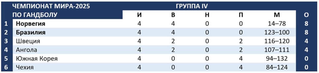 Первенство в четвертой группе оспорят Норвегия с Бразилией. Победитель матча встретится в четвертьфинале с Черногорией, проигравший – с Германией.