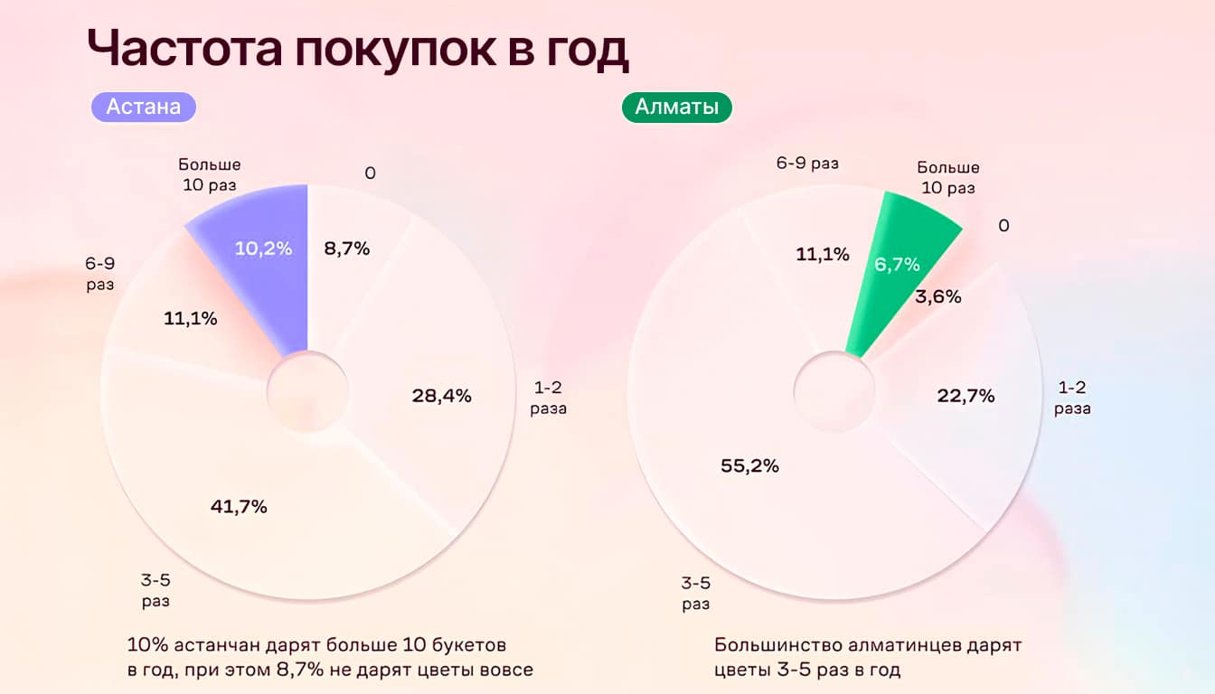 17% респондентов в Астане готовы потратить на семейные праздники более 30 тыс. тенге, еще 10% выбирают бюджет в 25–35 тыс. тенге для букетов на дни рождения. При этом почти три четверти опрошенных учитывают цену букета. В Астане также заметна полярность. Каждый десятый житель столицы покупает цветы более 10 раз в год, а 8,7% астанчан — ни разу.