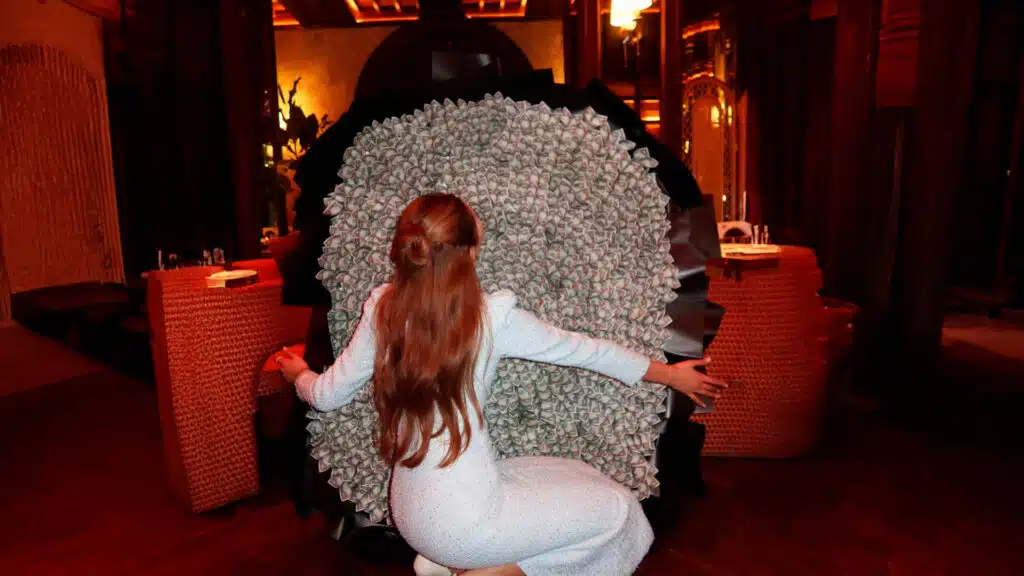 Видео с вручением неожиданного подарка блогерша выложила в Instagram. На кадрах ее застали посреди трапезы и вручили внушительный букет, сделанный из долларовых купюр. Кроме того к букету прилагался кейс с стопками 10-тысячных купюр как приглашение на свидание.