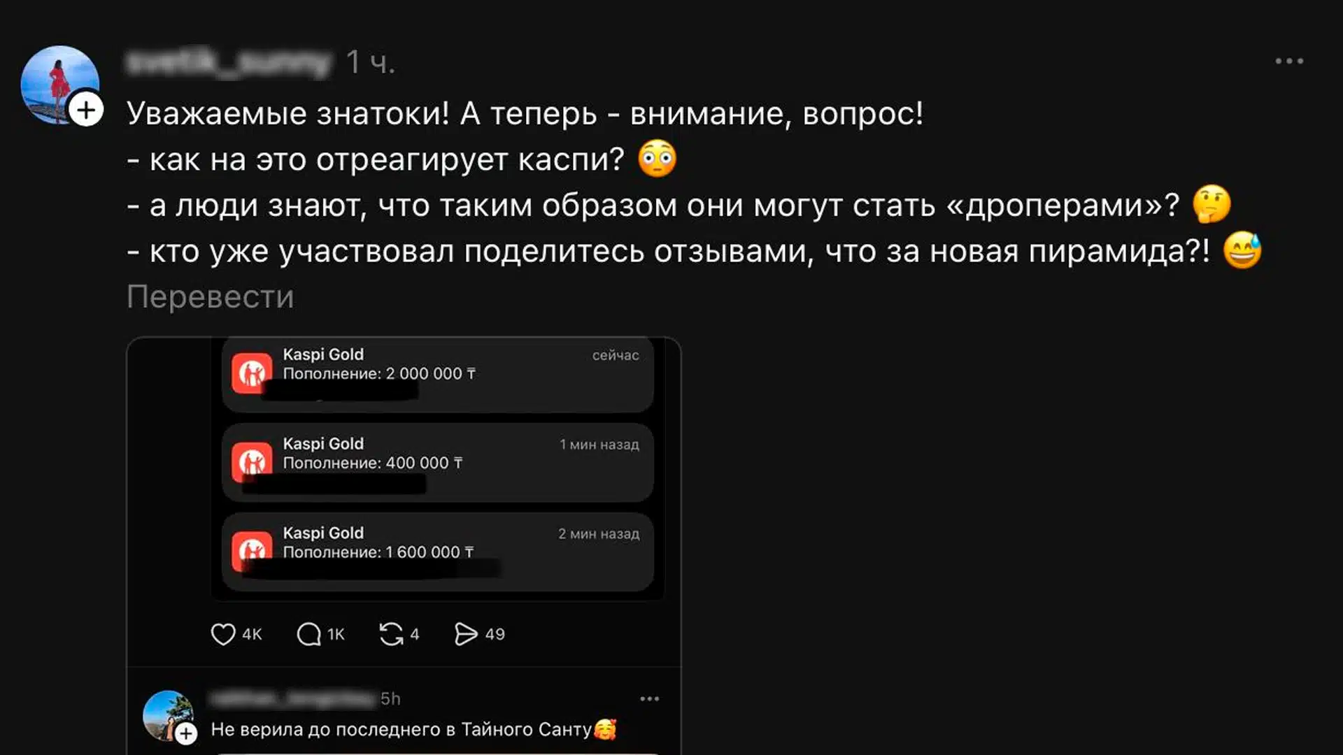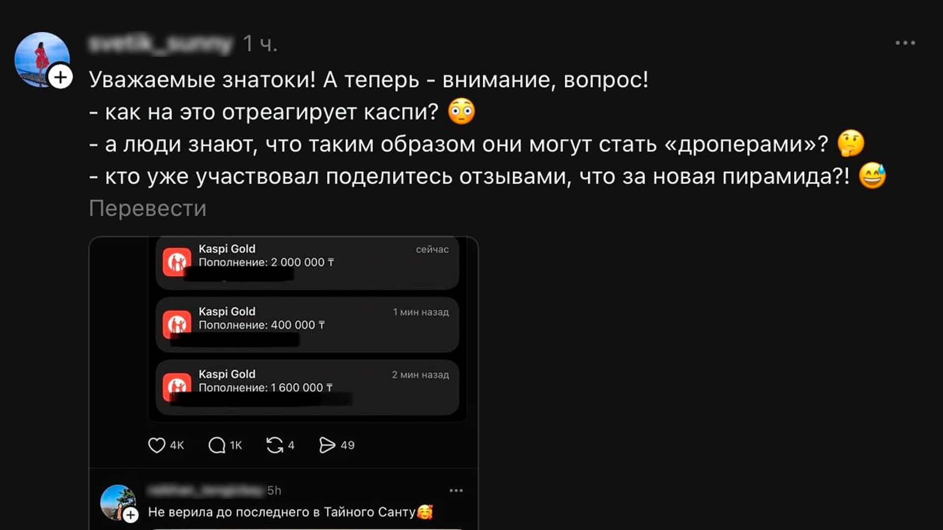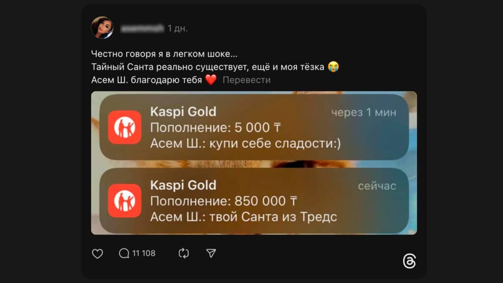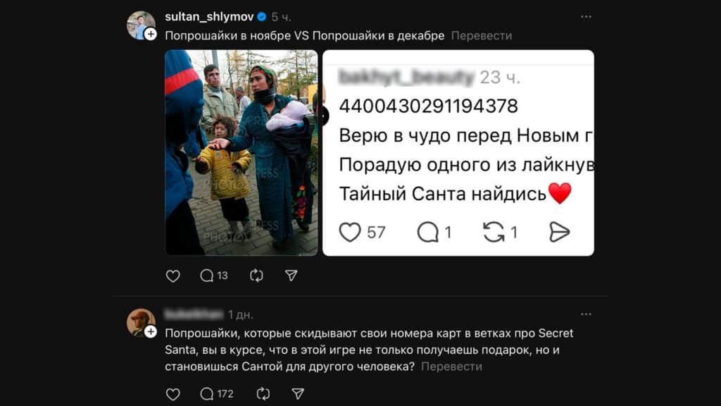 Механика проста: человек выкладывает номер карты и пишет, что «ждет Санту», а в ответ другие пользователи отмечают, что «отправили подарок». Такой флешмоб быстро разошелся по казахстанскому сегменту Threads. Некоторые пользователи даже выкладывают скриншоты с пополнением счета. Один из самых популярных постов такого рода на момент публикации набрал целых 10 тыс. комментариев с номерами карт.
