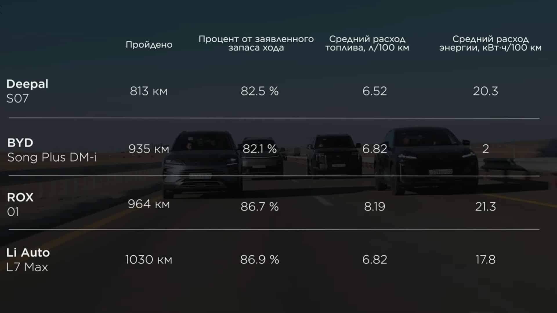 В заезде участвовали LiXiang L7, Rox 01, Deepal S07 и BYD Song Plus DM-i с заявленным суммарным запасом хода от 1 тыс. км.