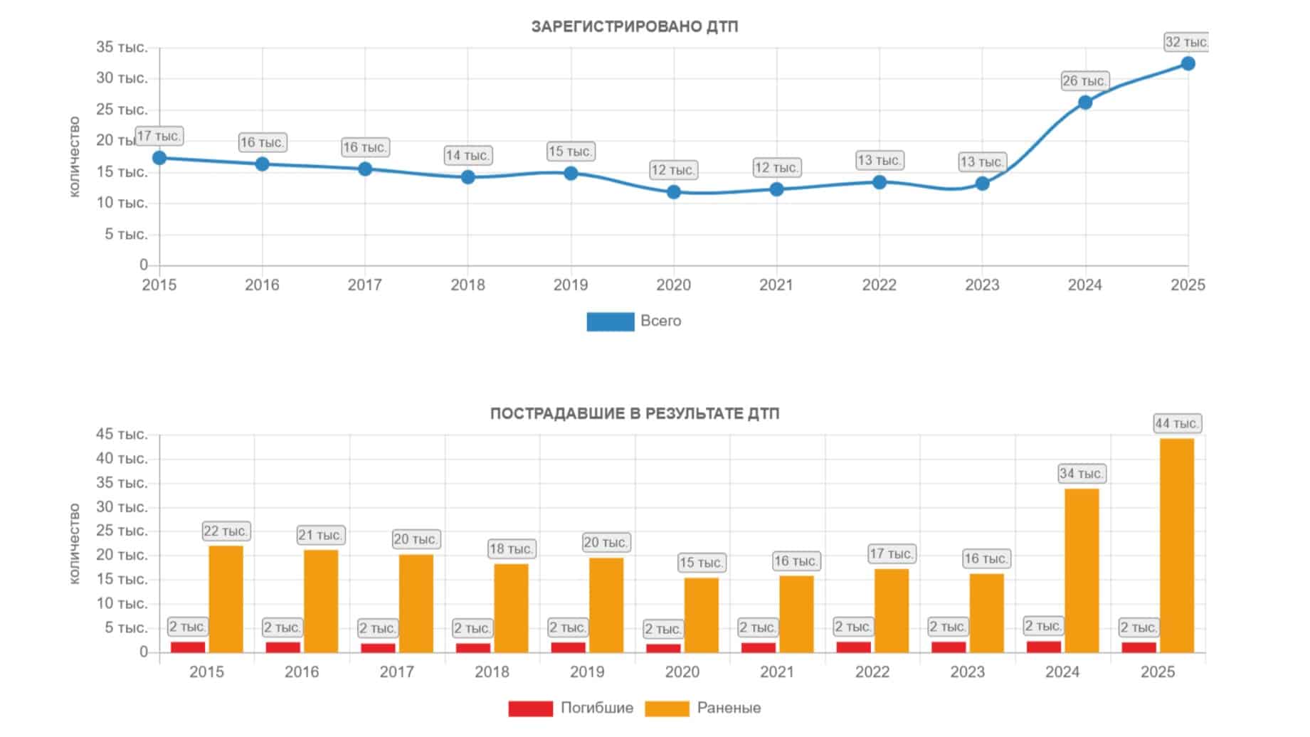 Статистика последних лет показывает устойчивый рост: если с января по ноябрь 2023 года было 13,2 тыс. аварий, то в 2025-м — уже 32,4 тыс. (+146%). Число раненых за два года увеличилось в 2,7 раза (44,2 тыс.). При этом по сравнению с 2024 годом раненых стало на 30,6% больше, а число погибших снизилось на 9,7%.