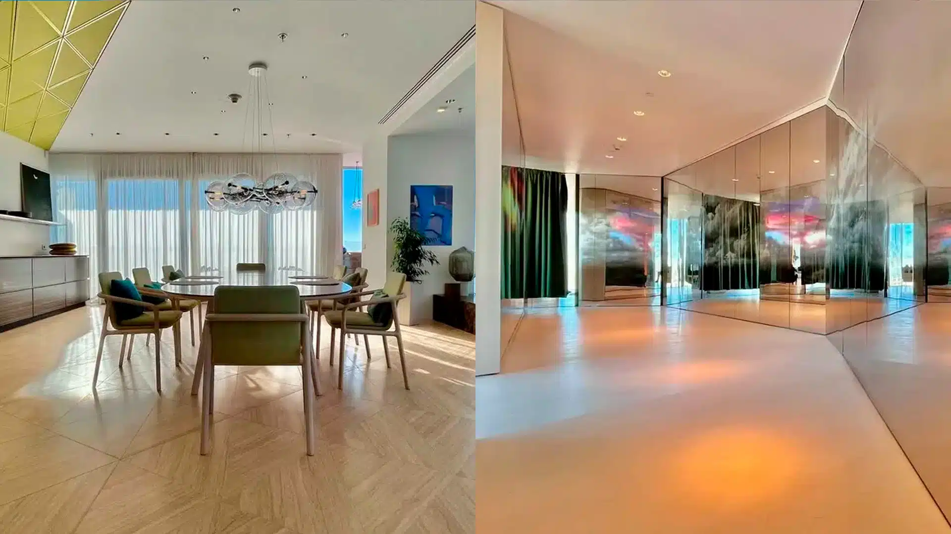 Речь идет о двухкомнатных апартаментах площадью 210 кв. м, расположенных на 34-м этаже башни Esentai Tower. Панорамные окна открывают вид на весь город, а дизайнерский интерьер выполнен с использованием дорогих материалов и системой «умный дом».