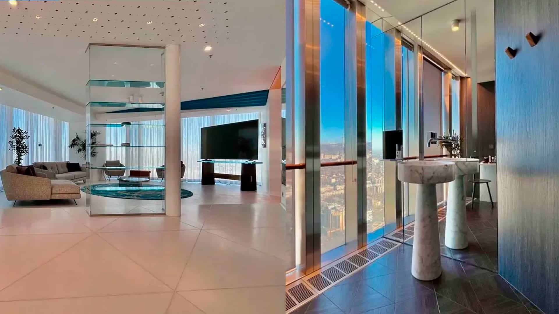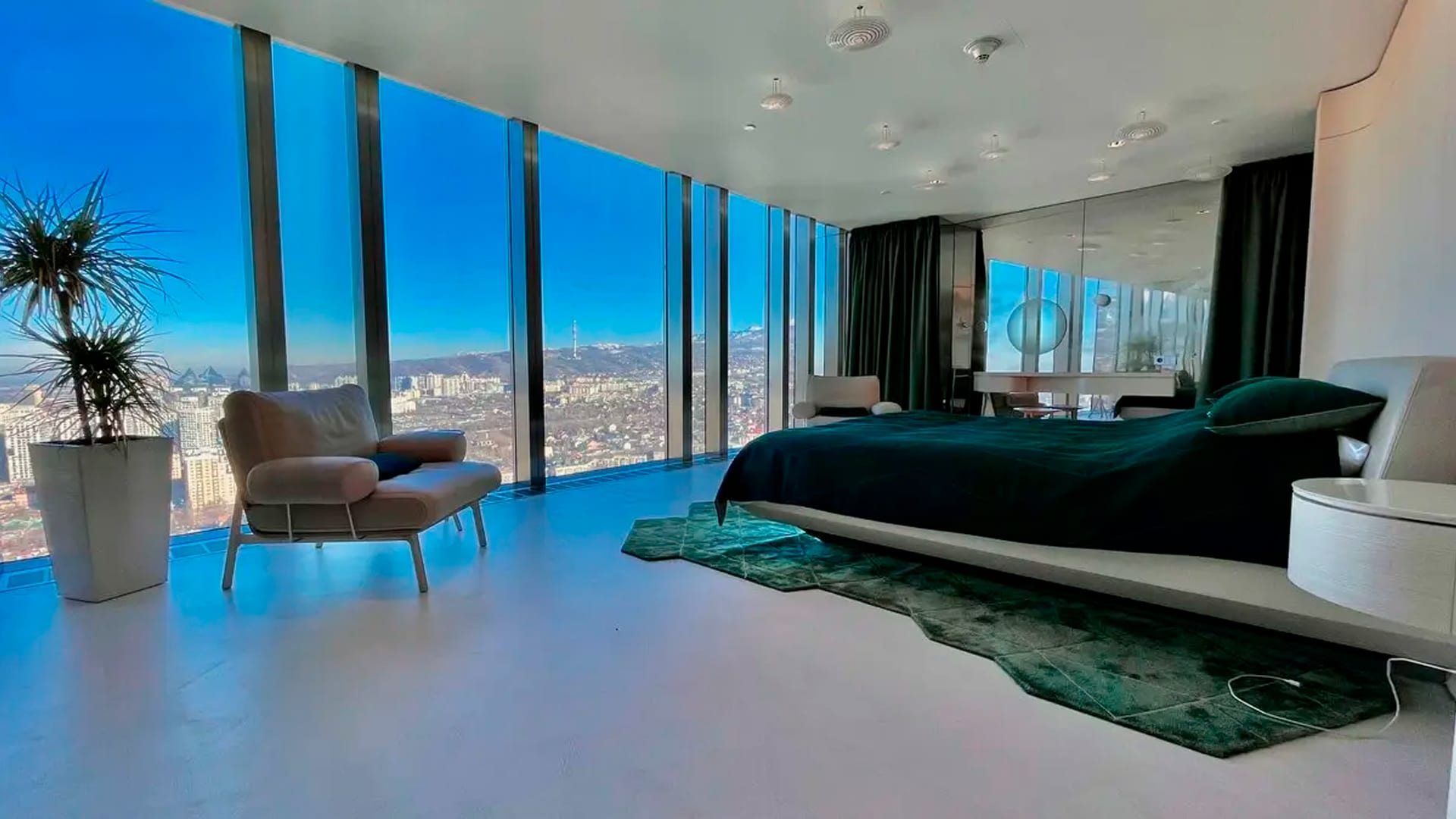 Речь идет о двухкомнатных апартаментах площадью 210 кв. м, расположенных на 34-м этаже башни Esentai Tower. Панорамные окна открывают вид на весь город, а дизайнерский интерьер выполнен с использованием дорогих материалов и системой «умный дом».