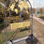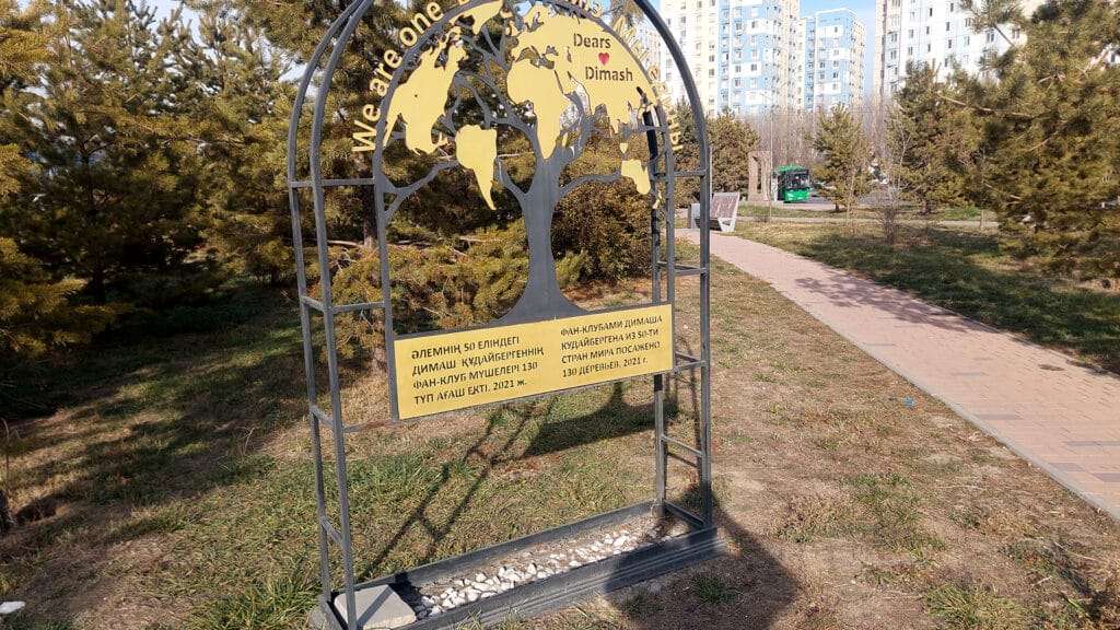 Ближе к Almaty Arena тянется небольшая аллея. На ее территории находится любопытная табличка. Оказывается, деревья здесь высадил фан-клуб Димаша Кудайбергена.