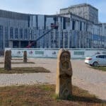 Чуть дальше – золотистые балбалы и еще одна стройка. Оказалось, что рядом находится академия традиционного искусства Алматы, где сейчас идут ремонтные работы. Местные рабочие обещают закончить работу к марту 2026 года.