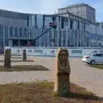 Чуть дальше – золотистые балбалы и еще одна стройка. Оказалось, что рядом находится академия традиционного искусства Алматы, где сейчас идут ремонтные работы. Местные рабочие обещают закончить работу к марту 2026 года.