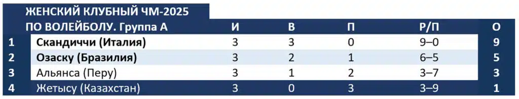 Как и ожидалось, на клубном ЧМ-2025 состоятся скрестные итало-бразильские полуфиналы. «Скандиччи», на старте победивший «Жетысу», поспорит за выход в финал с «Дентил Прайя», а «Просекко» – с «Озаску». Клубный чемпион мира среди женщин определится 14 декабря.