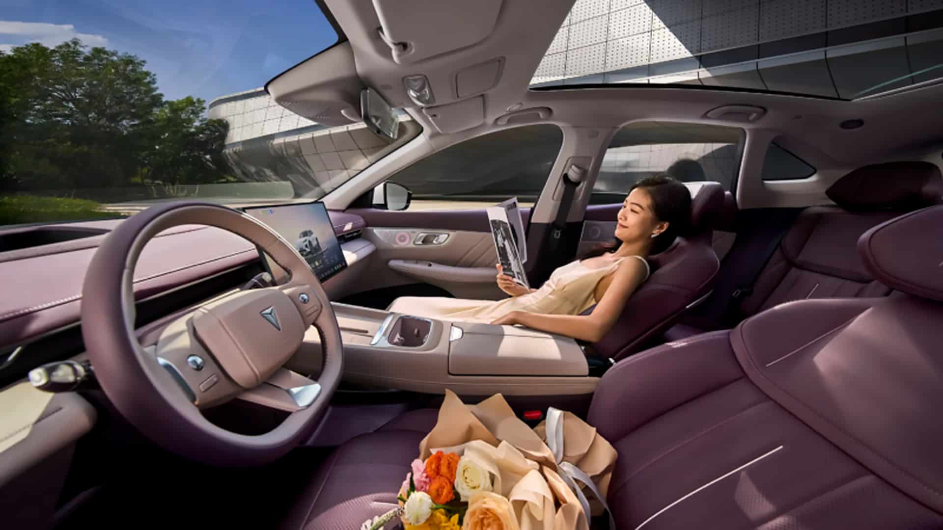 Задняя часть смотрится эффектно: спойлер, низкие габариты и спортивный характер. Спереди стоят двойные шумозащитные стекла, сзади – тонированные. Китайцы даже сделали интерактивную оптику: она может «вежливо» мигнуть пешеходу или показать спецанимации – мелочь, а приятно.