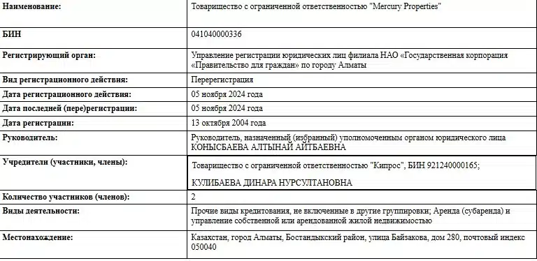 А вот МP Innovations владеет другое ТОО — Mercury Properties, учредителями которой являются ТОО «Кипрос» и Динара Кулибаева – средняя дочь Нурсултана Назарбаева.