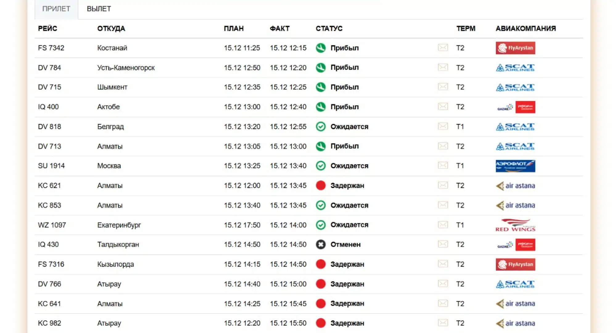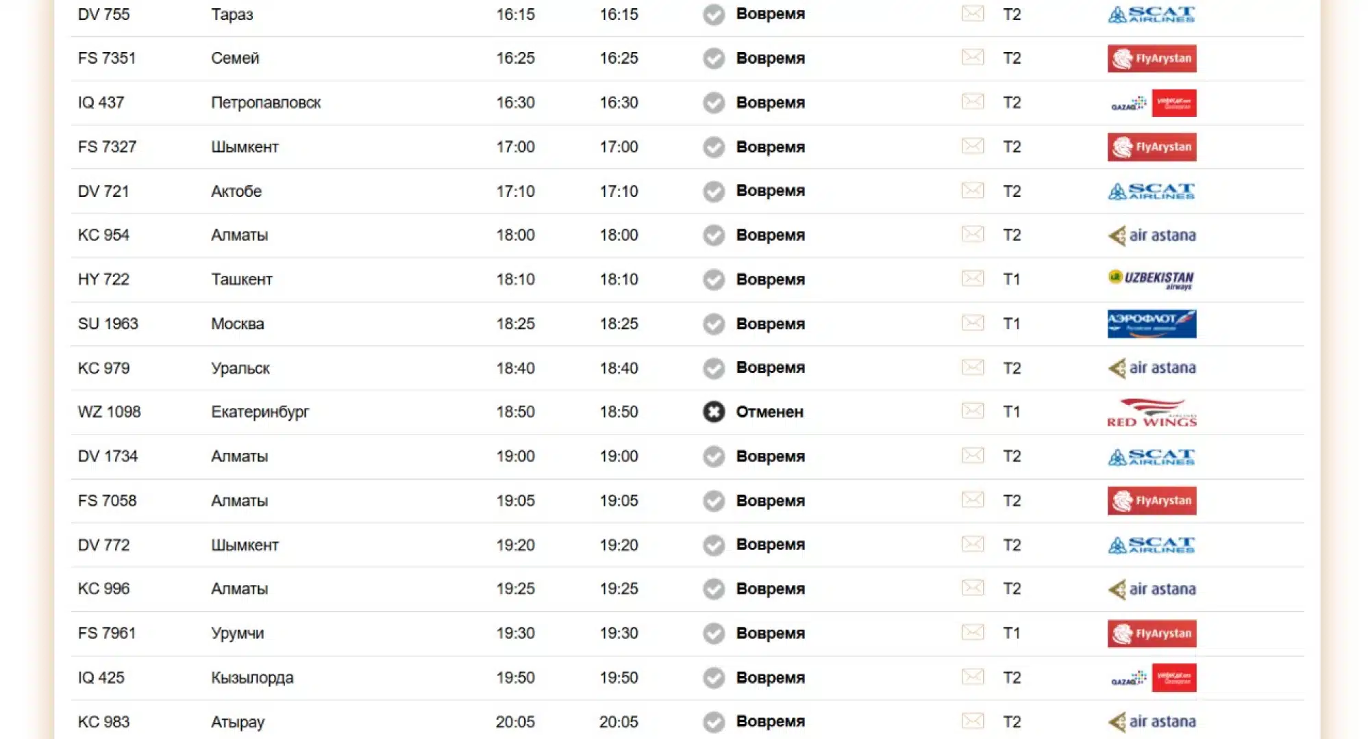Согласно данным онлайн-табло, часть рейсов на прилет выполняется с опозданием. В числе задержанных – рейсы из Алматы, Атырау, Кызылорды, Кутаиси и других направлений. Также отменены отдельные рейсы, в том числе из Талдыкоргана. При этом большинство рейсов продолжают выполняться по расписанию или с незначительными корректировками.