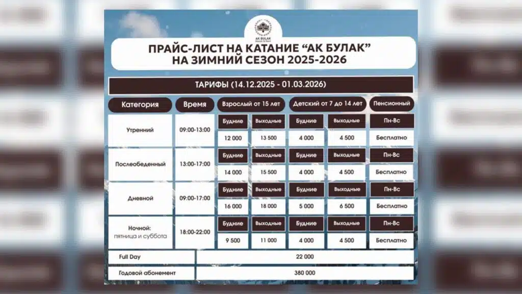 Сейчас дистанция с вершины курорта до отеля составляет 4 километра 200 метров. Основная трасса тянется на 2,5 км и туда ведет гондольная канатная дорога. Еще из приятных новшеств — спустя много лет в «Ак-Булаке» отменили плату за туалет. А ниже — цены на катания зимой 2025-2026.