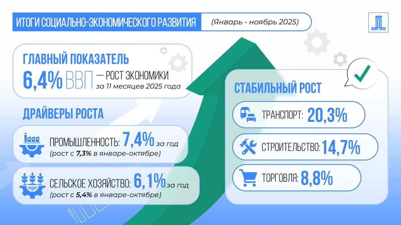 Экономика Казахстана выросла на 6,4% за январь-ноябрь 2025 года. Об этом на заседании правительства 17 декабря сообщил заместитель премьер-министра, министр национальной экономики РК Серик Жумангарин.