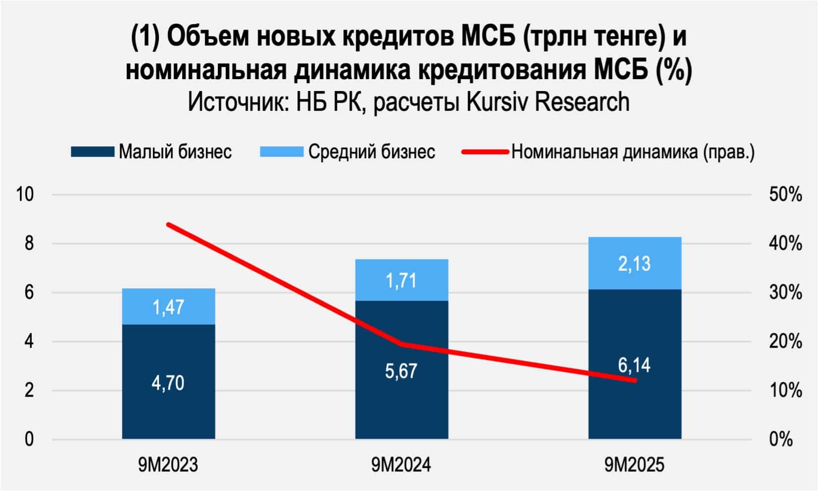 За девять месяцев 2025-го объем новых займов достиг почти 8,3 трлн тенге, показав номинальный рост в 12,1% по сравнению с аналогичным периодом предыдущего года. Однако нынешняя динамика сильно отстает от темпов прироста, зафиксированных в аналогичных периодах предыдущих двух лет (в 2023 году – 44,0%, в 2024 году – 19,5%). С корректировкой на инфляцию реальный рост кредитования МСБ составил всего 1,0%.