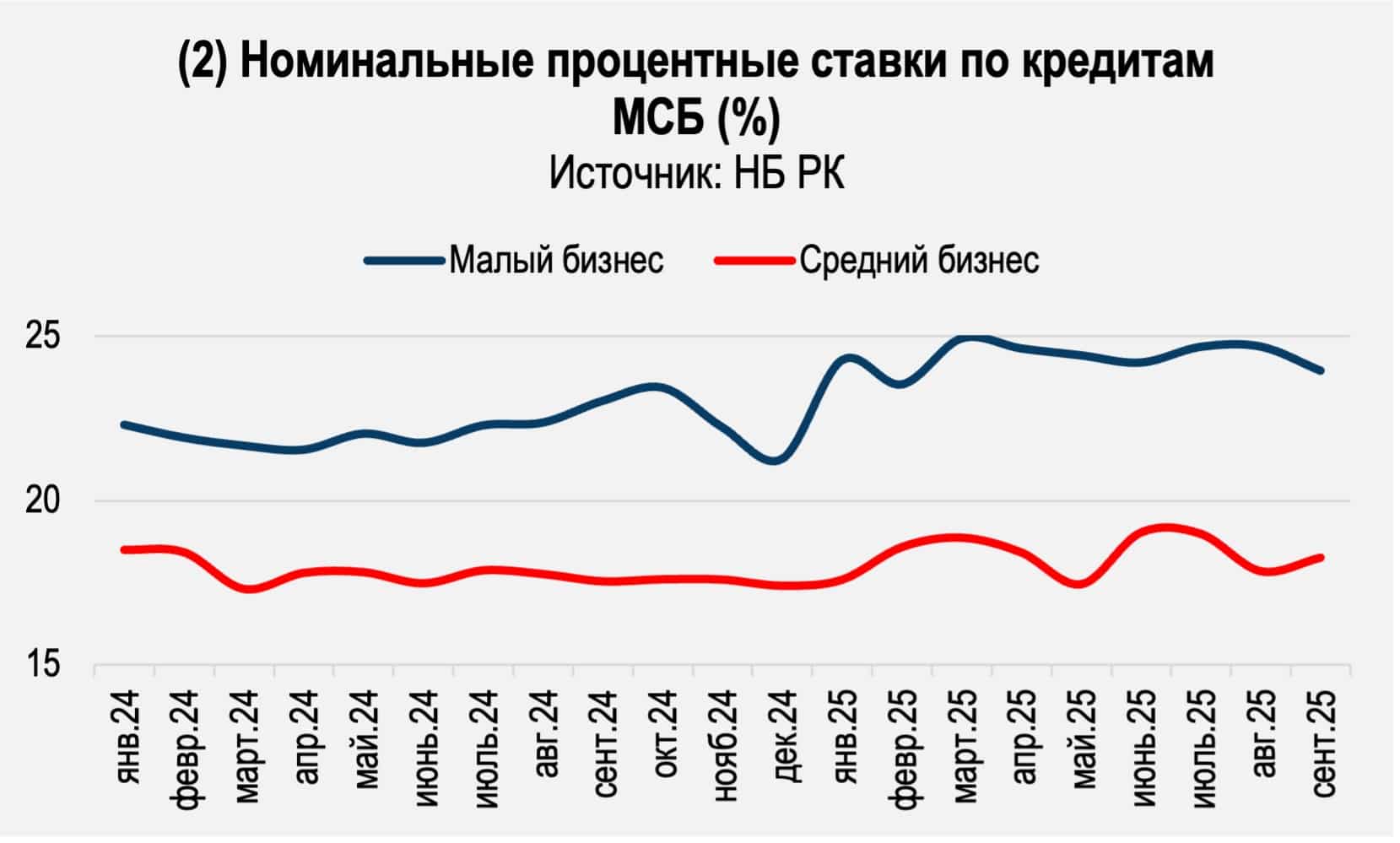 Очередной раунд ужесточения денежно-кредитной политики Нацбанк РК начал в декабре 2024 года, подняв базовую ставку до 15,25% (+1,0 п. п.). В марте 2025-го регулятор повысил ставку до 16,5%. В этих условиях замедлилось кредитование малого и среднего бизнеса банковским сектором (БВУ и Банк развития Казахстана).