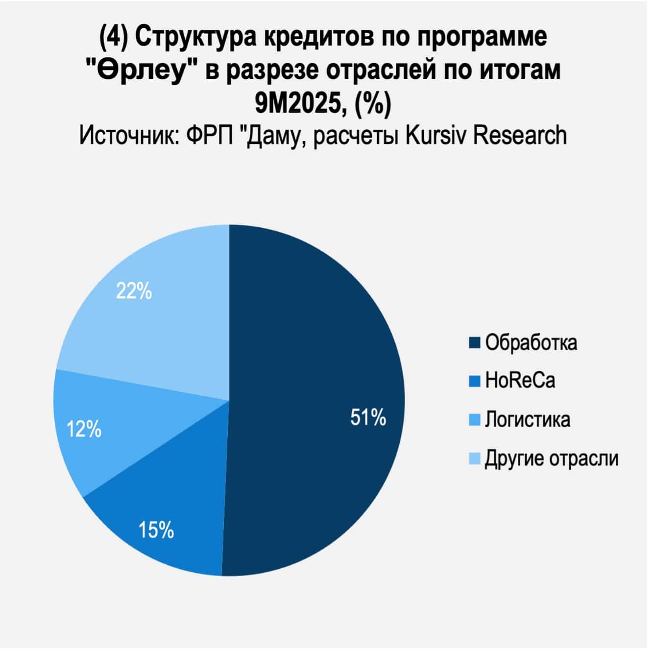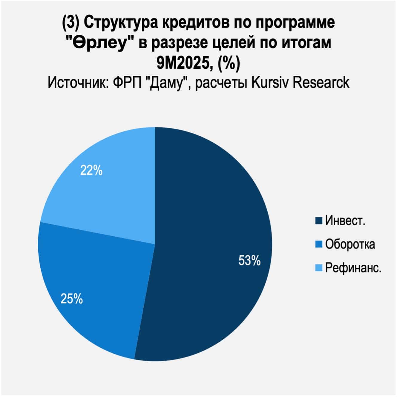 Расчеты Kursiv Research, сделанные на основе открытых данных «Даму», показывают, что с июня по сентябрь 2025 года по программе «Өрлеу» льготных займов было выдано на общую сумму 190,3 млрд тенге. Выданные средства распределились следующим образом: чуть более половины – на инвестиционные цели, четверть – на пополнение оборотных средств, остальное – на рефинансирование текущих займов.