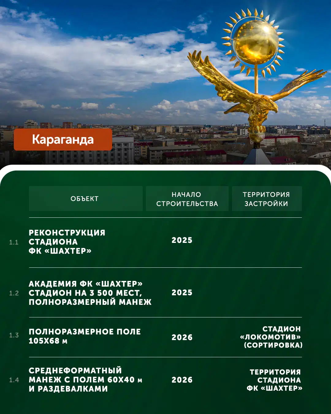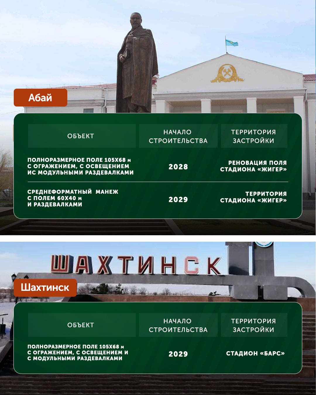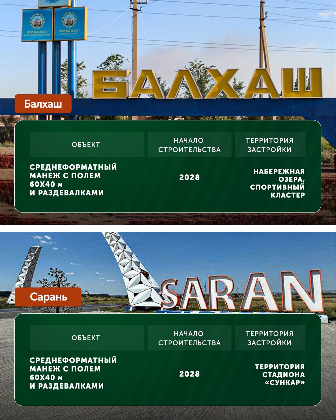 В 2028-м планируется приступить к строительству футбольной инфраструктуры в городах Абай (полноразмерное поле с ограждением, освещением и модульными раздевалками), Балхаш и Сарань (среднеформатные манежи).
