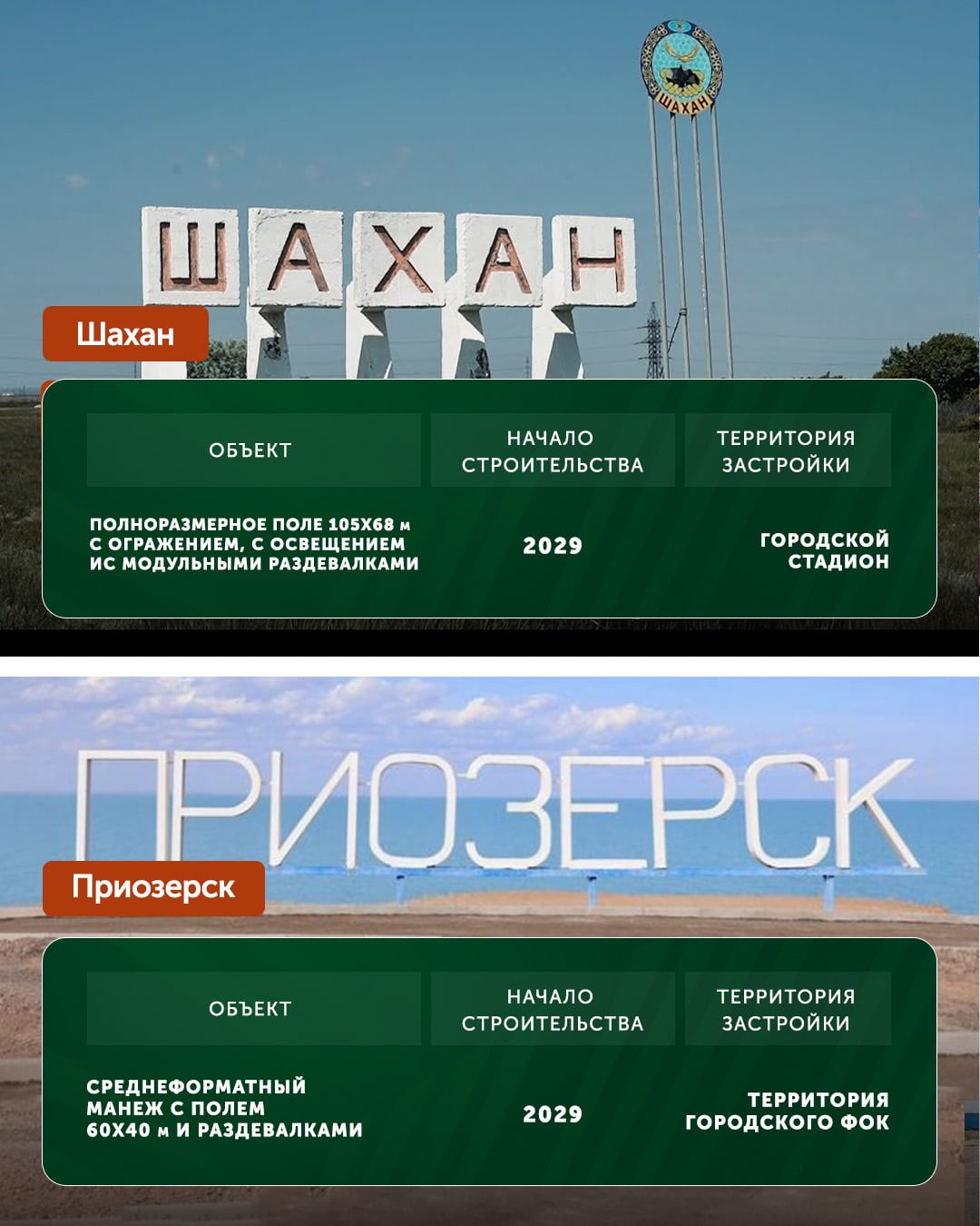 Наконец, в 2029 году в Абае и Приозерске начнут возводить среднеформатные манежи, а в Шахане и Шахтинске – полноразмерные тренировочные поля.