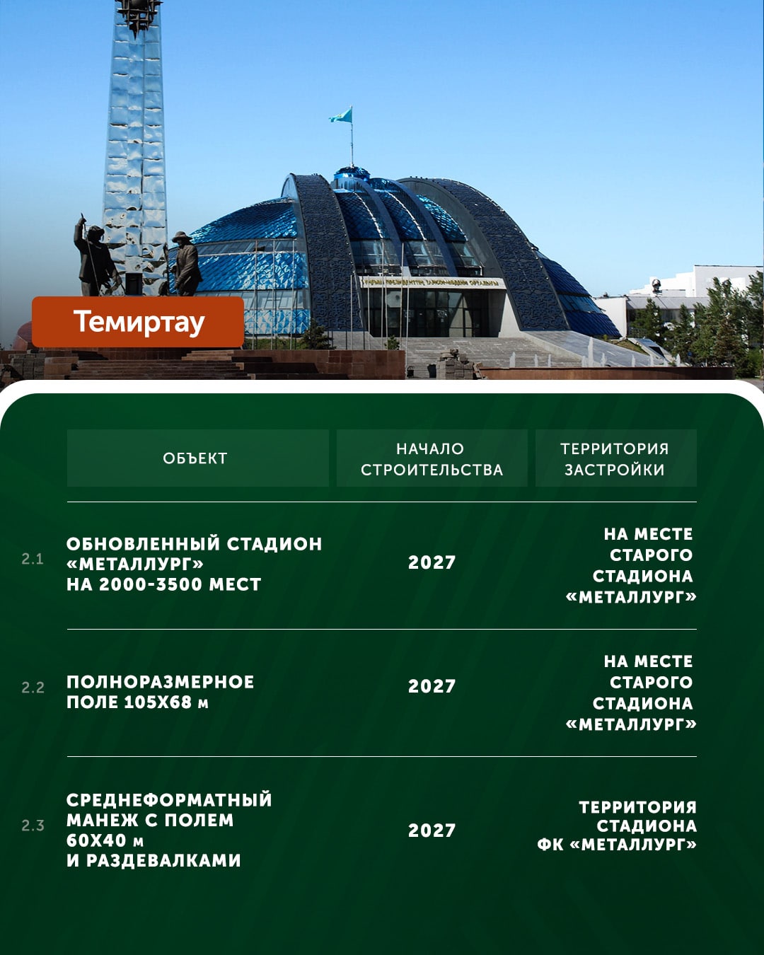 Крупные проекты будут реализованы не только в Караганде. Так, Темиртау получит обновленный стадион «Металлург», способный вместить несколько тысяч болельщиков, а также полноразмерное поле и среднеформатный манеж. Старт строительных работ запланирован на 2027 год.