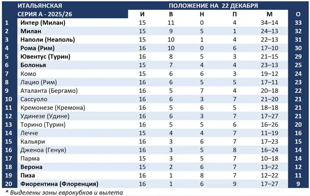 До Нового года в Серии А успеют сыграть 17-й тур, а затем, со 2 по 11 января, команды и вовсе проведут по три матча. Таким образом, о каком-либо отдыхе говорить не приходится. Тем более, что семь итальянских клубов продолжают бороться за евротрофеи. «Аталанта», «Интер», «Ювентус» и «Наполи» в Лиге чемпионов, «Рома» и «Болонья» – в Лиге Европы, а «Фиорентина» – в Лиге конференций.