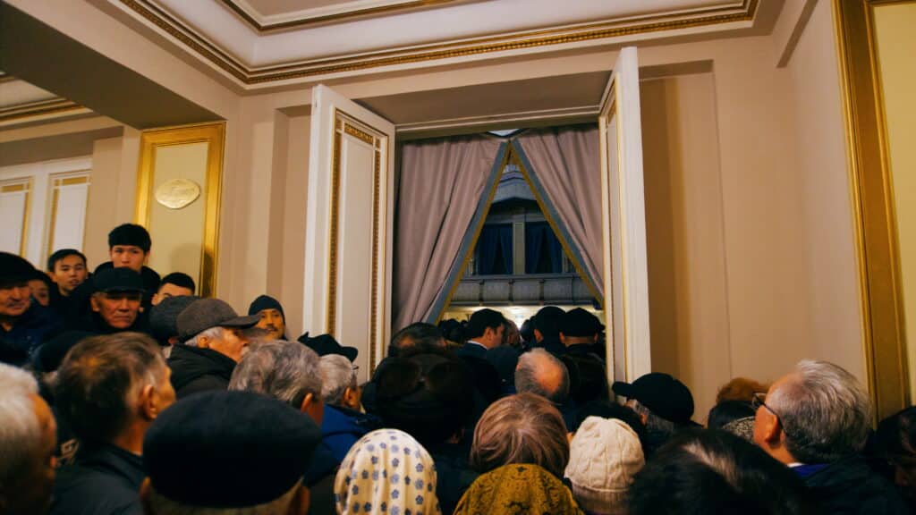 Прощание с актером стало по-настоящему народным. Уже к 10:00 зал театра был переполнен. Свободных мест не осталось ни в рядах, ни у стен. Те, кто приходил позже, останавливались в фойе или ждали снаружи. Поток людей не иссякал, и за порядком во время церемонии наблюдали полицейские.