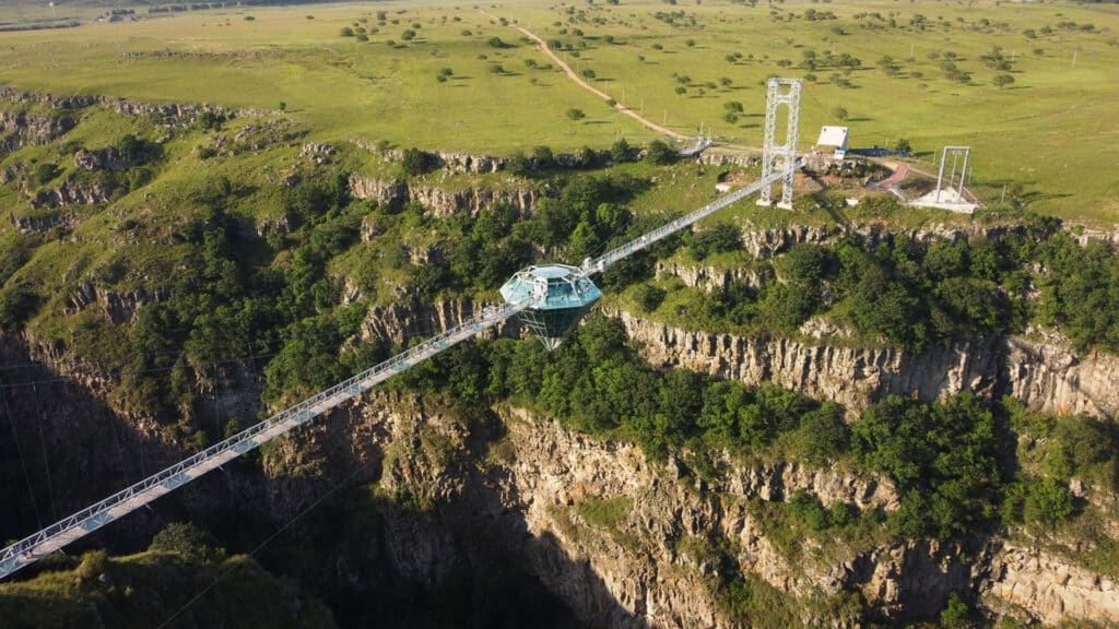 А на высоте 210 м над водопадами подвешен стеклянный «Алмазный мост» длиной 240 м – часть туристической инфраструктуры комплекса Kass Land. В центре моста — панорамное кафе «Diamond 360» в форме алмаза.