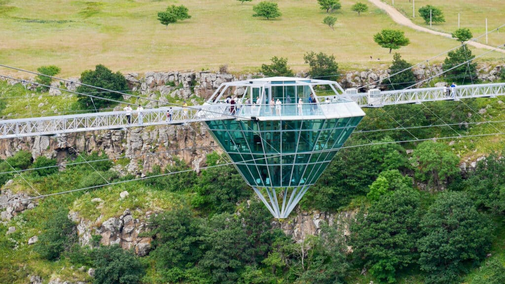А на высоте 210 м над водопадами подвешен стеклянный «Алмазный мост» длиной 240 м – часть туристической инфраструктуры комплекса Kass Land. В центре моста — панорамное кафе «Diamond 360» в форме алмаза.
