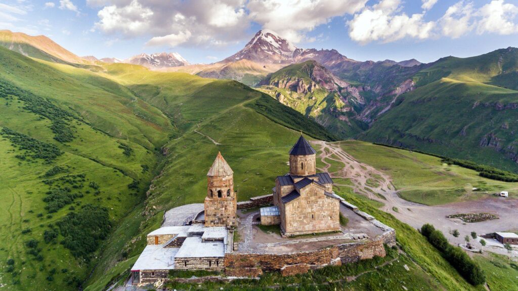В этой локации удобно планировать радиальные выходы от деревни Степанцминда. От нее начинается хайкинг к церкви Гергети Тринити, расположенной на высоте 2 170 м. Пеший подъем занимает примерно 1–1,5 часа, а от церкви открывается впечатляющая панорама на Казбек (5 033 м) — одну из самых эффектных вершин Кавказа.