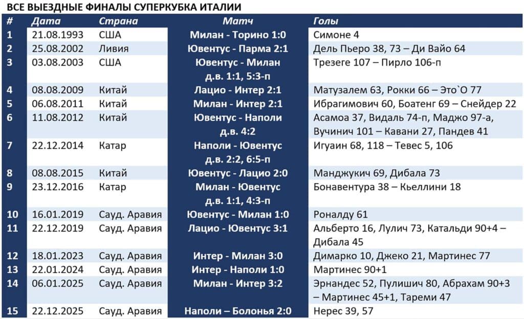 «Наполи» 18 декабря в Эр-Рияде победил «Милан» 2:0 (Нерес 39, Хейлунн 64), а «Болонья», сыграв вничью с «Интером» 1:1 (Орсолини 35 – Тюрам 2-п), одолела экс-соперника «Кайрата» в серии пенальти 3:2.