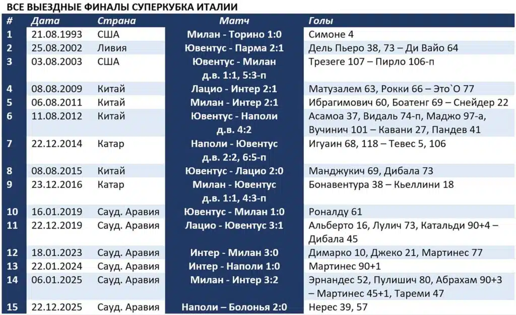 «Наполи» 18 декабря в Эр-Рияде победил «Милан» 2:0 (Нерес 39, Хейлунн 64), а «Болонья», сыграв вничью с «Интером» 1:1 (Орсолини 35 – Тюрам 2-п), одолела экс-соперника «Кайрата» в серии пенальти 3:2.