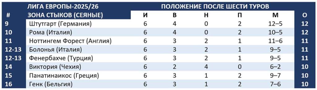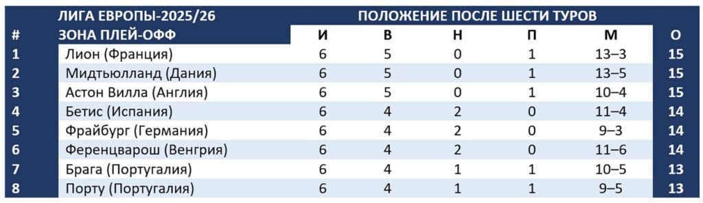После шести туров общую таблицу вместе с датчанами возглавляют французский «Лион» и английская «Астон Вилла». Восемь лучших команд напрямую выйдут в плей-офф Лиги Европы. Шесть из них уже обеспечили себе место в стыках. Помимо перечисленных, это испанский «Бетис», немецкий «Фрайбург» и венгерский «Ференцварош».