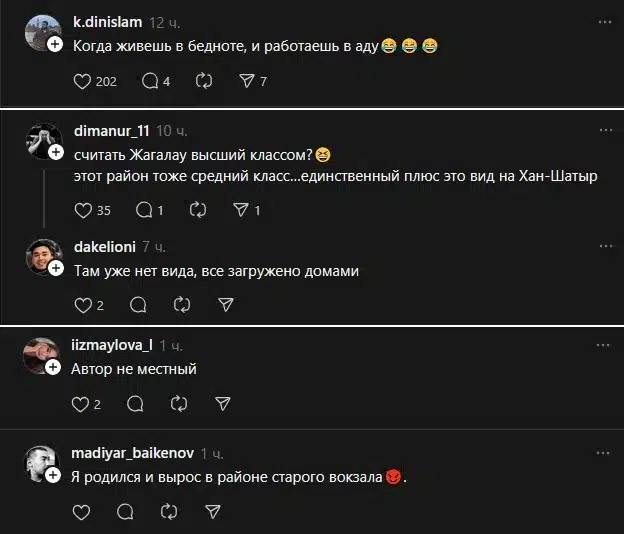 В комментариях отметили, что набережную и «Золотой квадрат» отнесли к «бедноте», хотя там дорогие квартиры и живут обеспеченные люди. Жилые дома за «Хан-Шатыром» назвали «высшим классом», но многие находят тот район обычным и средним.