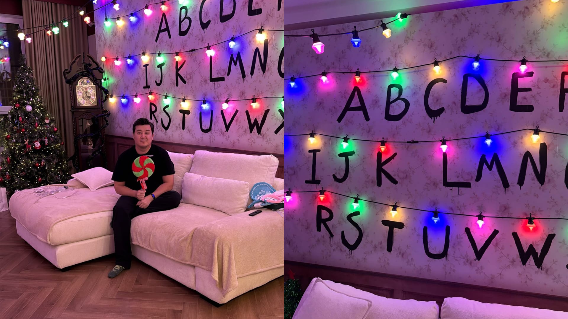 В соцсетях он опубликовал фотографии интерьера, где на стене появились нарисованные буквы алфавита, а поверх них – разноцветная гирлянда, точь-в-точь как в доме семьи Байерс из первого сезона сериала. Атмосферу дополняют приглушенный свет, новогодняя елка и общий «мистический» вайб, знакомый всем поклонникам проекта Netflix.