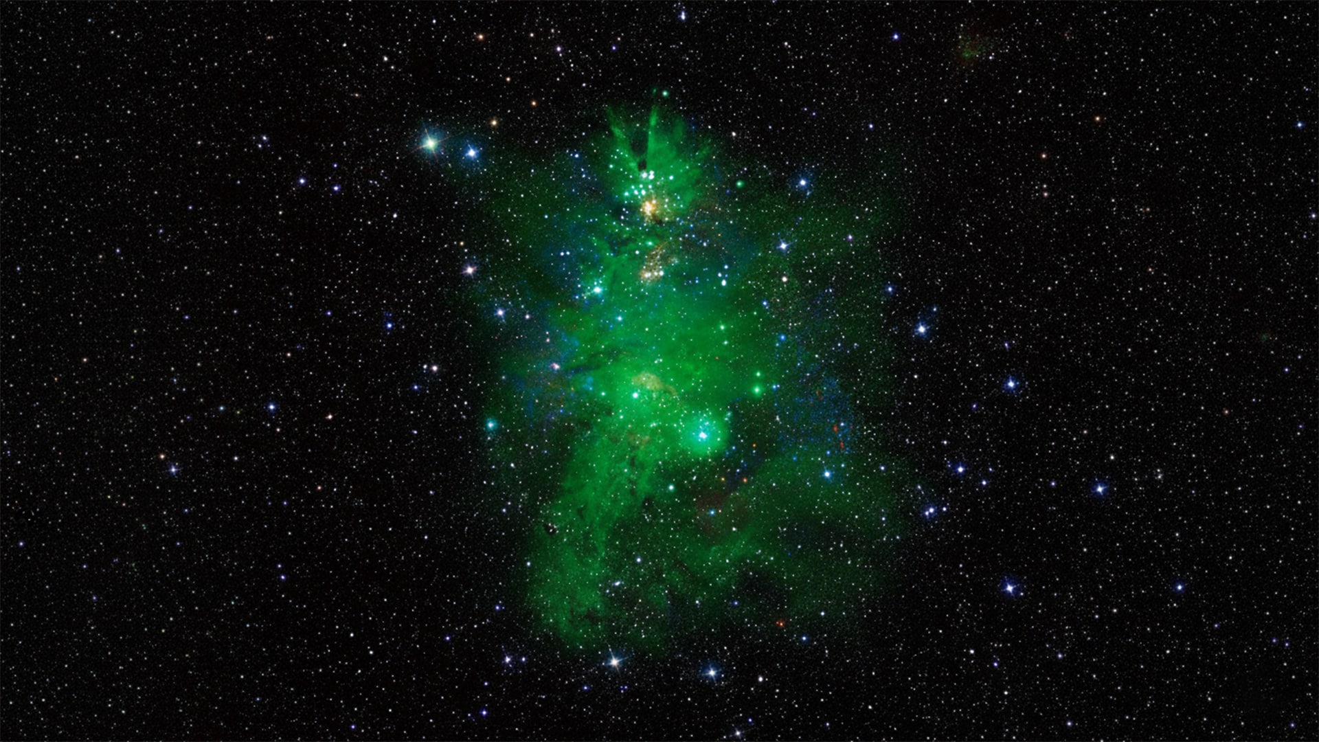 На фото видно, как россыпь молодых звезд будто светится гирляндами, а окружающее облако газа напоминает пушистые ветви. Все это выглядит так, словно кто-то украсил елку прямо в глубине Млечного Пути.