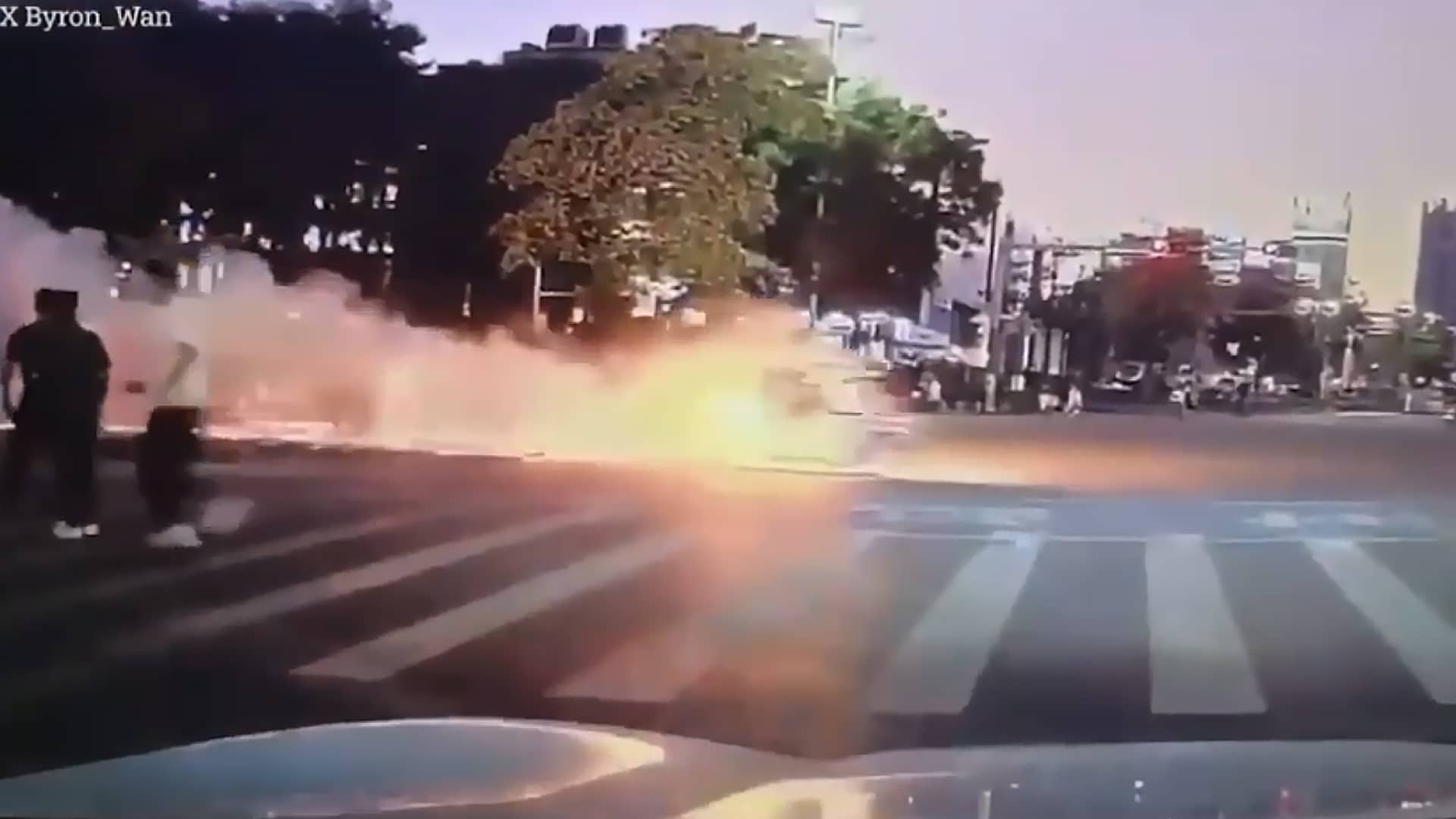 На кадрах видно, как курьер делает резкий поворот, после чего электровелосипед внезапно вспыхивает. Сначала огонь появляется снизу, но уже через пару секунд техника и водитель оказываются в пламени. Затем мужчина катится по асфальту, пытаясь сбить огонь.