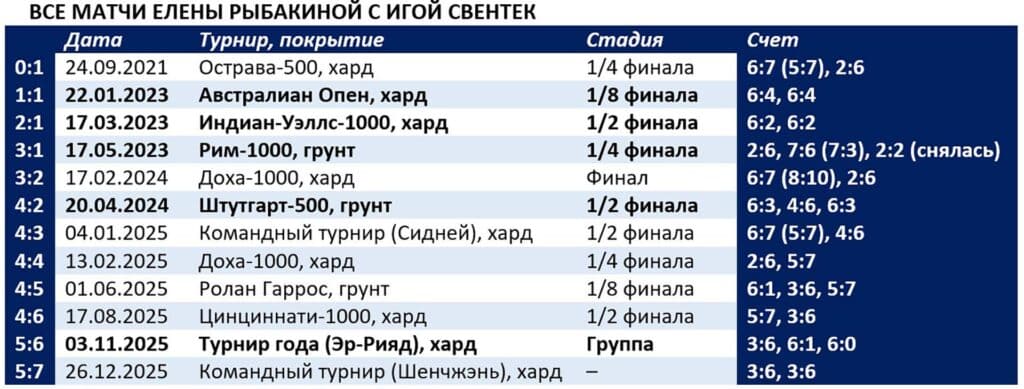 Последнее на сегодня рандеву теннисисток завершилось победой Рыбакиной. 3 ноября на Итоговом турнире года WTA Елена, отдав первый сет 3:6, уверенно взяла второй и третий – 6:1, 6:0. Попутно сократив отрыв Иги в личных встречах до минимума – 5:6. И выиграв турнир в Эр-Рияде в итоге.