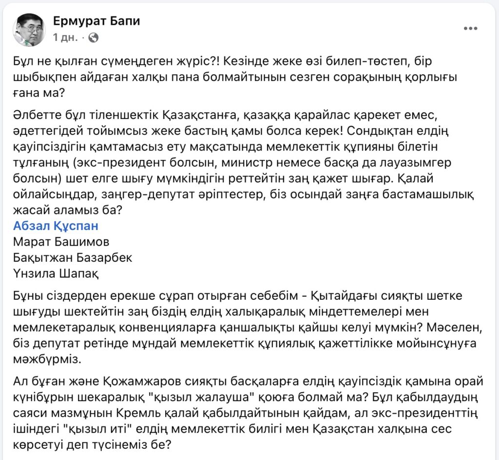 Ранее в своем Facebook депутат резко раскритиковал визит Назарбаева к Владимиру Путину, назвав его «странным и бессмысленным поведением».