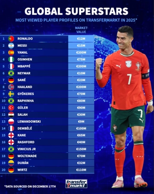 Портал Transfermarkt опубликовал рейтинг футболистов, чьи профили были самыми просматриваемыми в 2025 году. Больше всех пользователи ресурса интересовались португальцем Криштиану Роналду. В тройку лидеров вошли также аргентинец Лионель Месси и юный испанец Ламин Ямаль. Обладатель «Золотого мяча» Усман Дембеле занял в рейтинге лишь 14-е место.