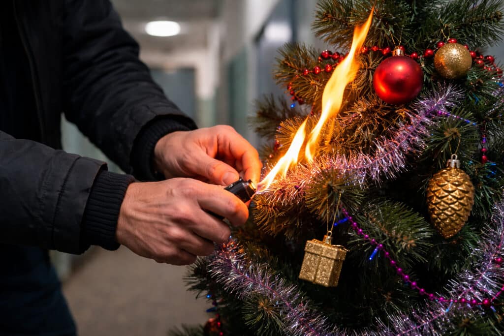 Инцидент попал в объективы камер видеонаблюдения. На записях видно, как один из жильцов подъезда поджигает установленную внутри искусственную елку. Мужчина наблюдал за происходящим до тех пор, пока праздничный атрибут полностью не оказался охвачен огнем. В результате пламя перекинулось и на другие элементы новогоднего оформления.