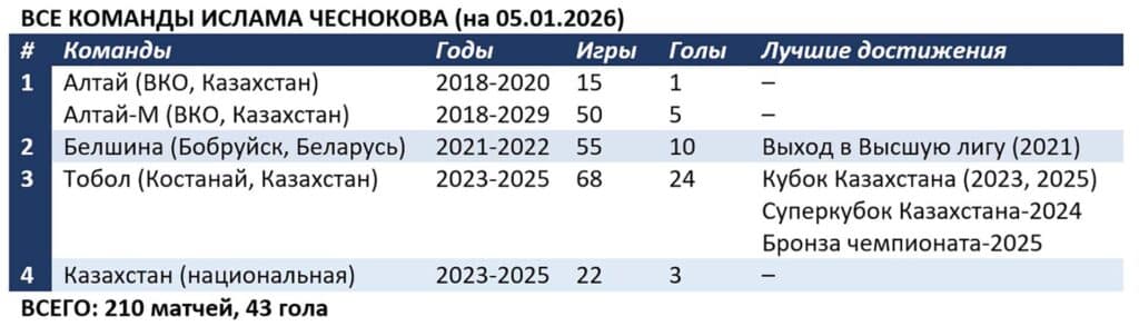 Ислам вновь помог команде Нурбола Жумаскалиева выиграть Кубок Казахстана. А также завоевал с «Тоболом» бронзу КПЛ-2025 и путевку в еврокубки. Будущим летом костанайцы стартуют в квалификации Лиги конференций. Правда, уже без Чеснокова. Сам Ислам, если его новая команды завоюет золото, начнет с «Хартсом» с раунда плей-офф квалификации Лиги чемпионов.