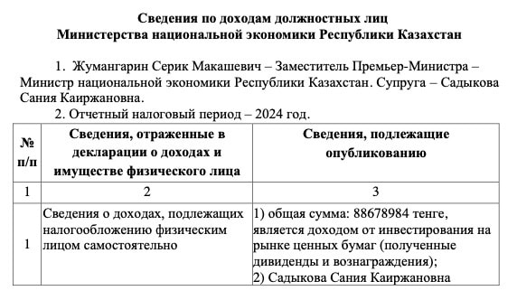 При этом из документа сразу неясно, кто задекларировал данный доход – сам вице-премьер или его супруга. Однако позднее пресс-служба МНЭ пояснила изданию Bes.Media, что заработок получен Санией Садыковой.
