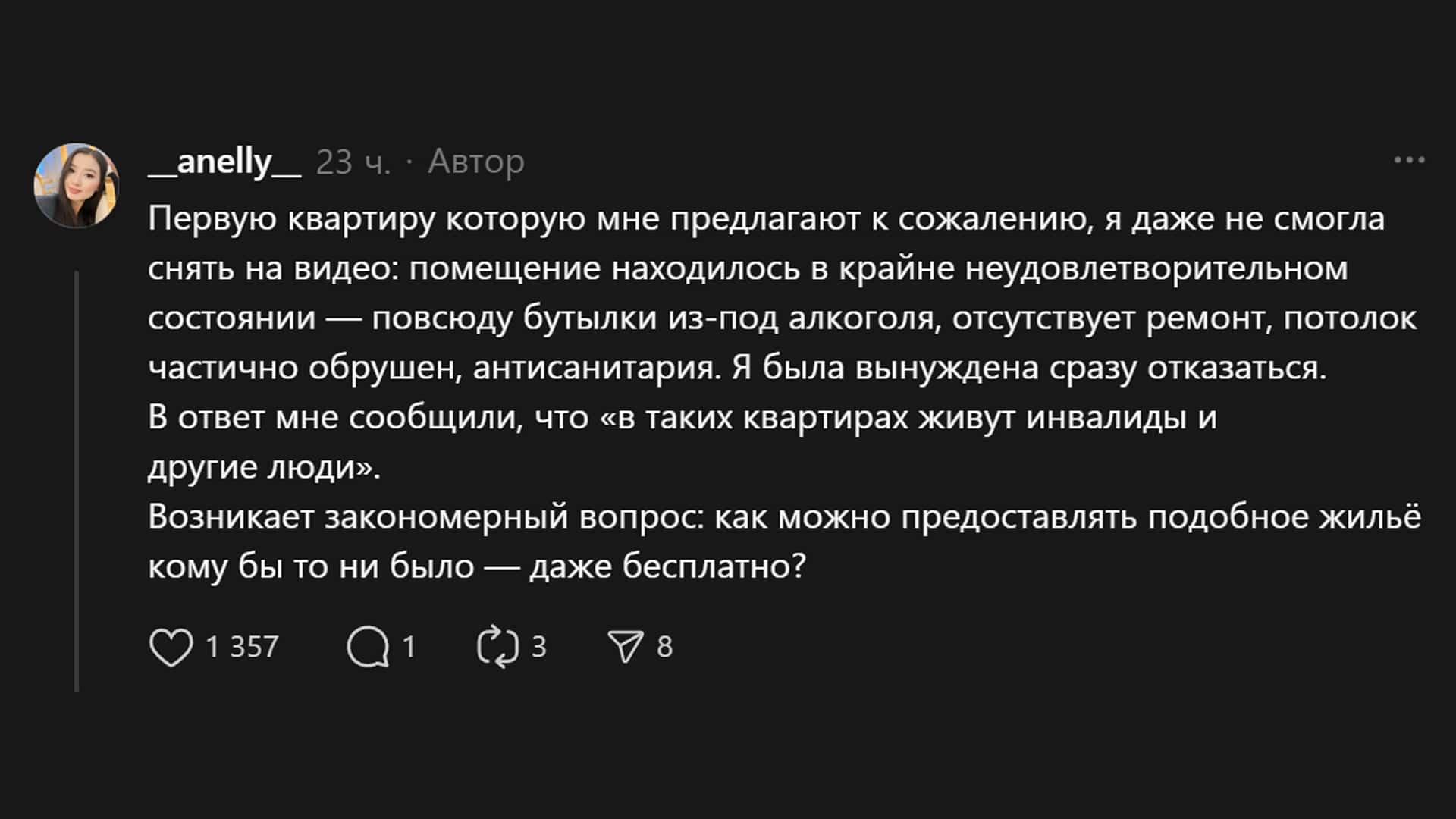 «Медицинский работник – не человек второго сорта. И служебное жилье – это не подвал и не место, куда стыдно даже зайти. Я требую в первую очередь как человек. И говорю не только за себя, мне страшно и больно думать о других людях, которым предлагают жить в таких условиях. Как вообще можно считать это нормой?» – резюмировала специалист.