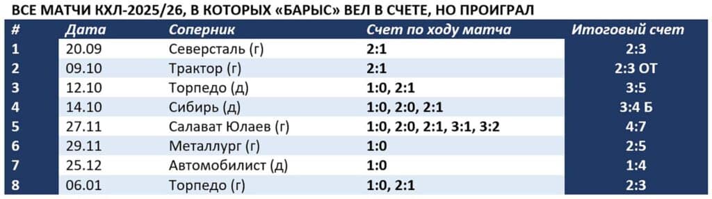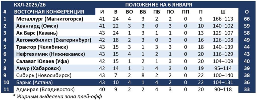 28-е поражение в сезоне опустило «Барыс» на предпоследнее место в Восточной конференции. Ниже только «Адмирал». Хотя по потерянным очкам дальневосточники уже опережают казахстанцев. Подопечные Михаила Кравца все дальше от зоны плей-офф.