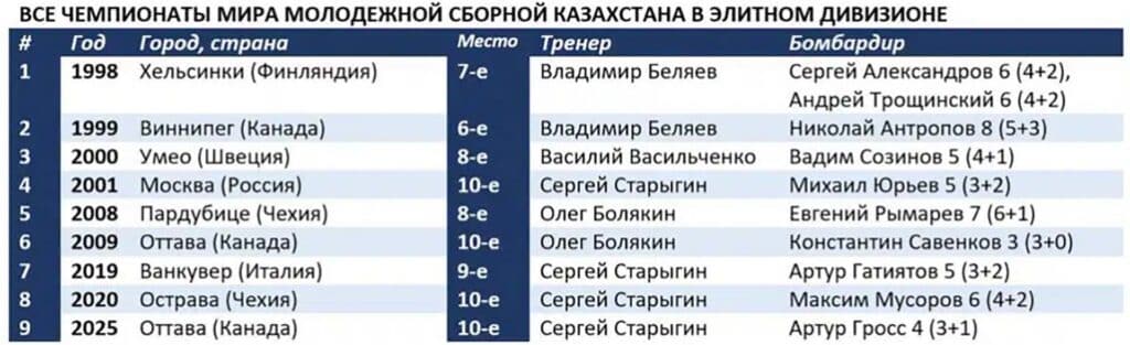 Сборная Казахстана дебютировала в элите молодежного ЧМ в 1998 году. Наши парни провели в классе сильнейших восемь турниров. Последний на сегодня – в 2025 году в Оттаве.