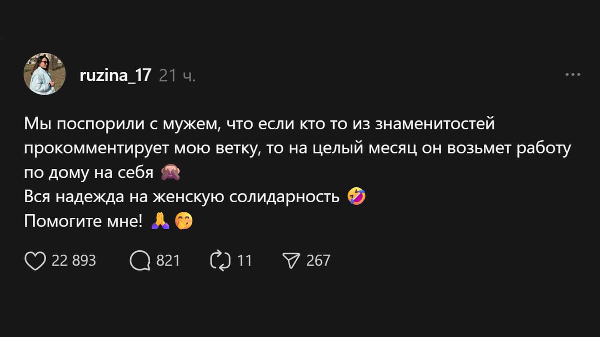 Пользовательница Threads рассказала, что поспорила с мужем. Если ее пост прокомментирует кто-то из знаменитостей, все домашние обязанности на месяц перейдут к нему. Девушка призналась, что рассчитывает на «женскую солидарность» и попросила подписчиков о помощи.