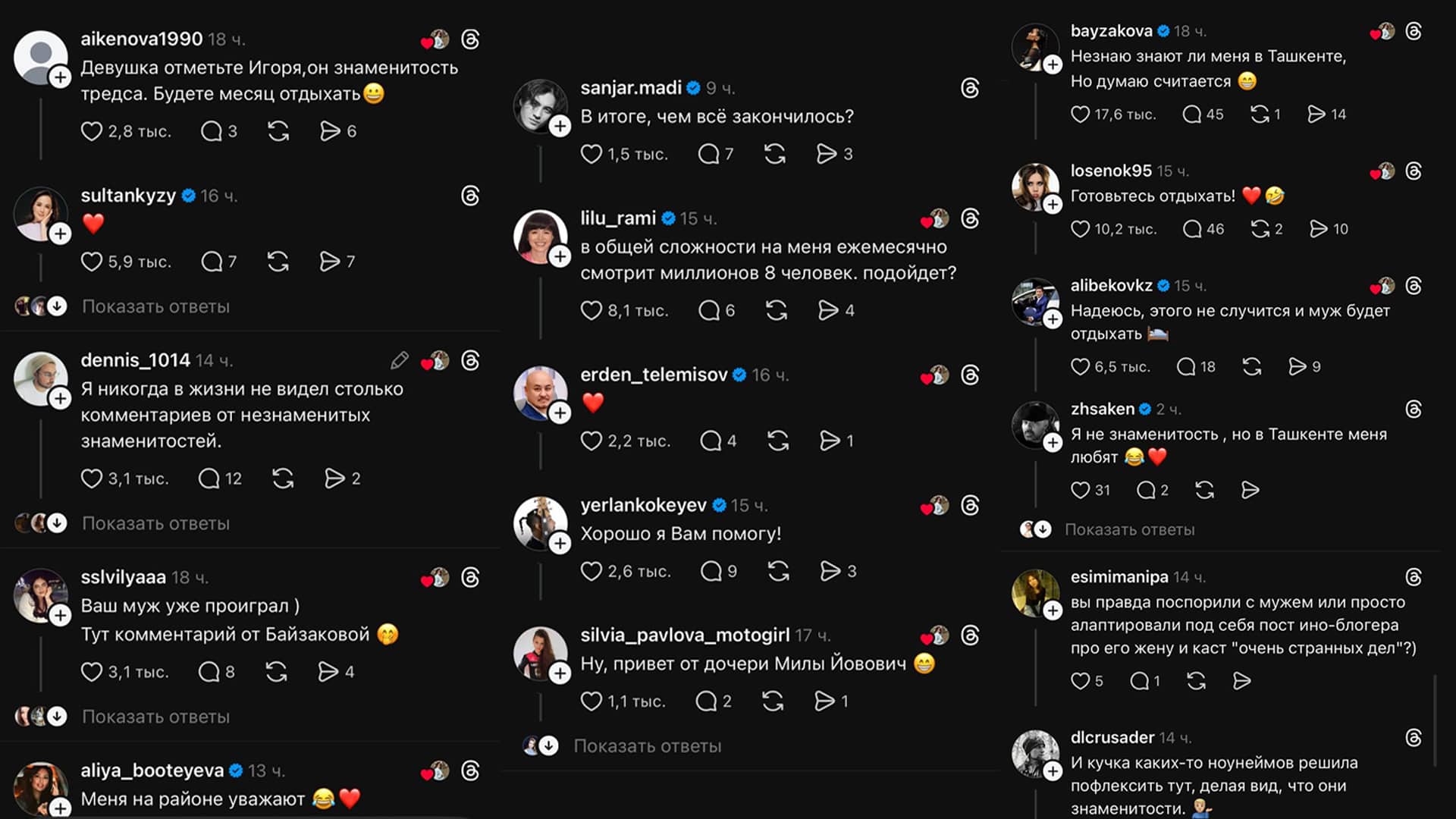 Пост быстро стал вирусным и собрал сотни тысяч просмотров. В комментариях начали появляться известные личности, в том числе ведущая шоу «Натальная карта» Олеся Иванченко, блогеры Айжан Байзакова и Бейбит Алибеков, актеры Санжар Мади, Ерден Телемисов и другие.