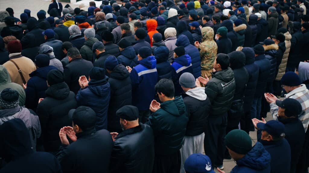К 10:00 начался джаназа-намаз. В общих рядах плечом к плечу стояли и известные актеры, и те, кто знал Мурата Бисенбина лишь по экрану.