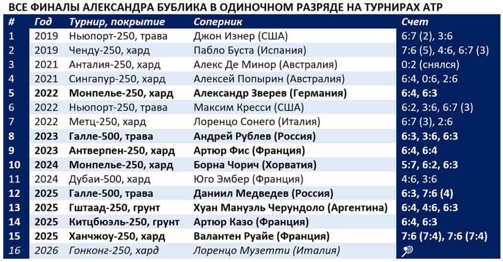 Завтрашний финал с Музетти будет 16-м матчем Бублика за трофей АТР. Восемь из них казахстанец выиграл. В личных играх с итальянцем небольшое преимущество на стороне Бублика – 2:1. В случае третьей победы казахстанец в понедельник впервые ворвется в топ-10 мирового рейтинга.