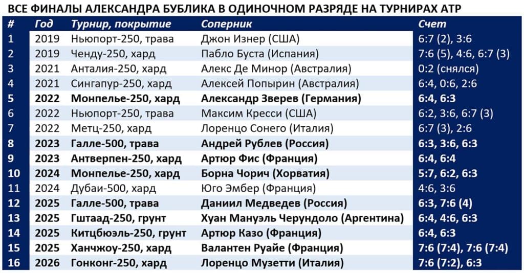 Титул короля турниров АТП-250, завоеванный Бубликом в прошлом году, безусловно, неофициален. Однако уверенности казахстанцу, конечно, добавил. Правда, есть нюанс. Во всех прошлогодних финалах в этой категории Александр встречался с теннисистами, стоявшими ниже его в рейтинге.