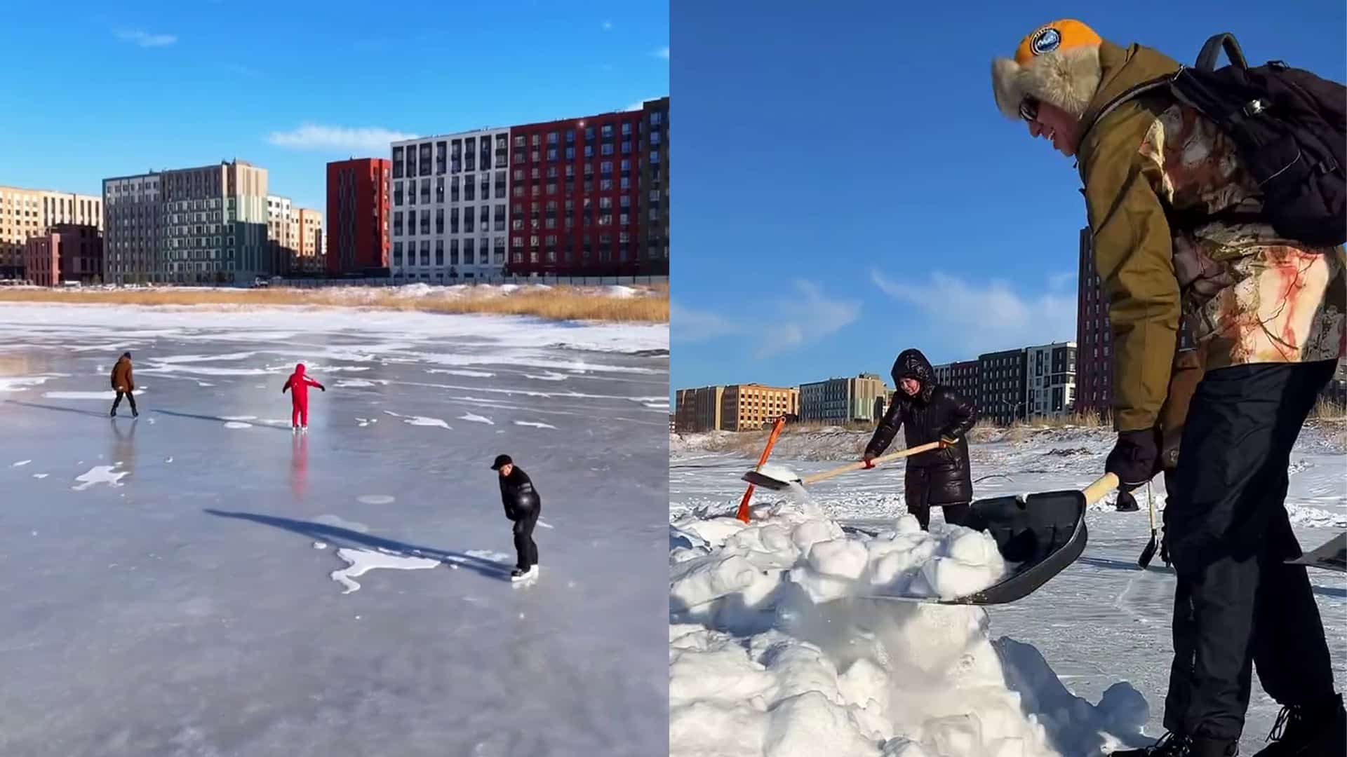 Люди выходят на лед с лопатами и убирают снег, чтобы можно было безопасно кататься на коньках и проводить досуг на свежем воздухе.